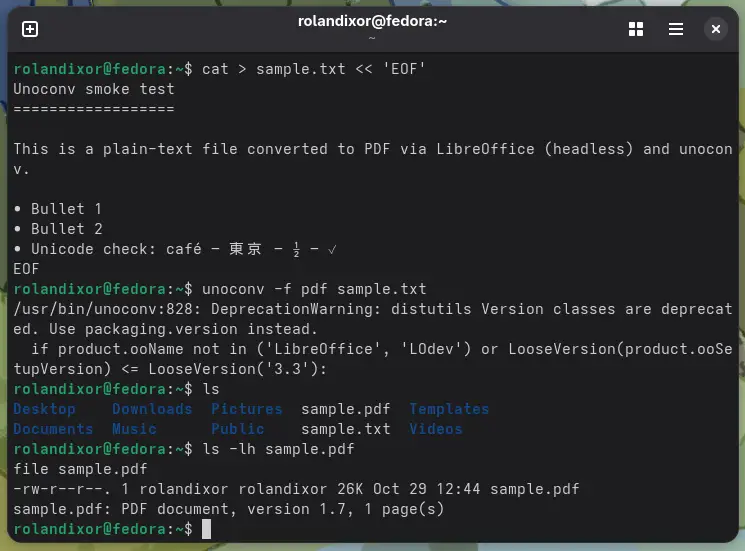 sudo dnf install unoconv libreoffice-writer libreoffice-calc libreoffice-impress libreoffice-pyuno python3-setuptools dejavu-sans-fonts liberation-fonts