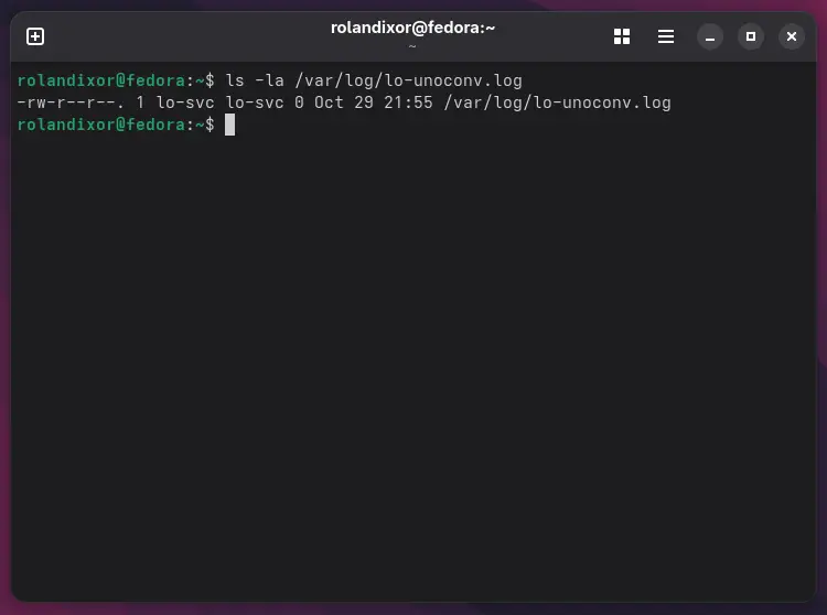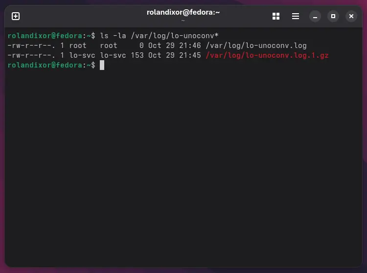ls -la /var/log/lo-unoconv.logThis should show the file is owned by lo-svc:lo-svc and has 644 (-rw-r--r–) permissions.