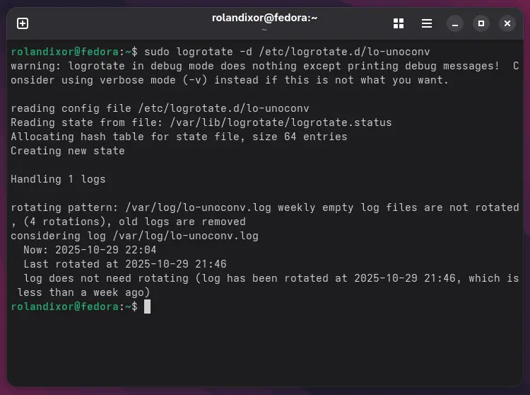 sudo logrotate -d /etc/logrotate.d/lo-unoconvThe -d flag runs in debug mode and shows what logrotate would normally do.