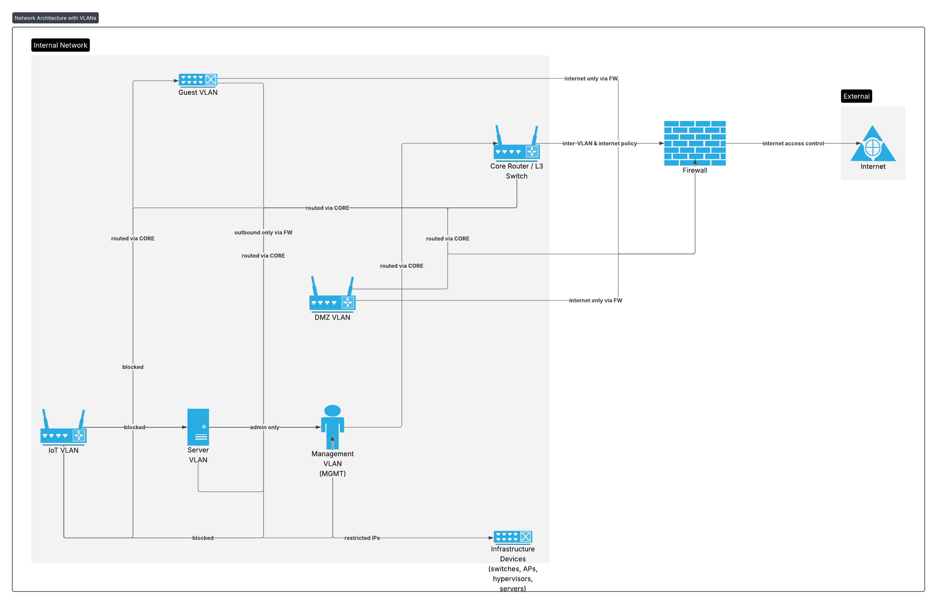 - IoT: Due to the security risks of IoT devices, they should be placed in their own VLAN. Ensure that firewall rules prevent these devices from connecting to sensitive network areas.